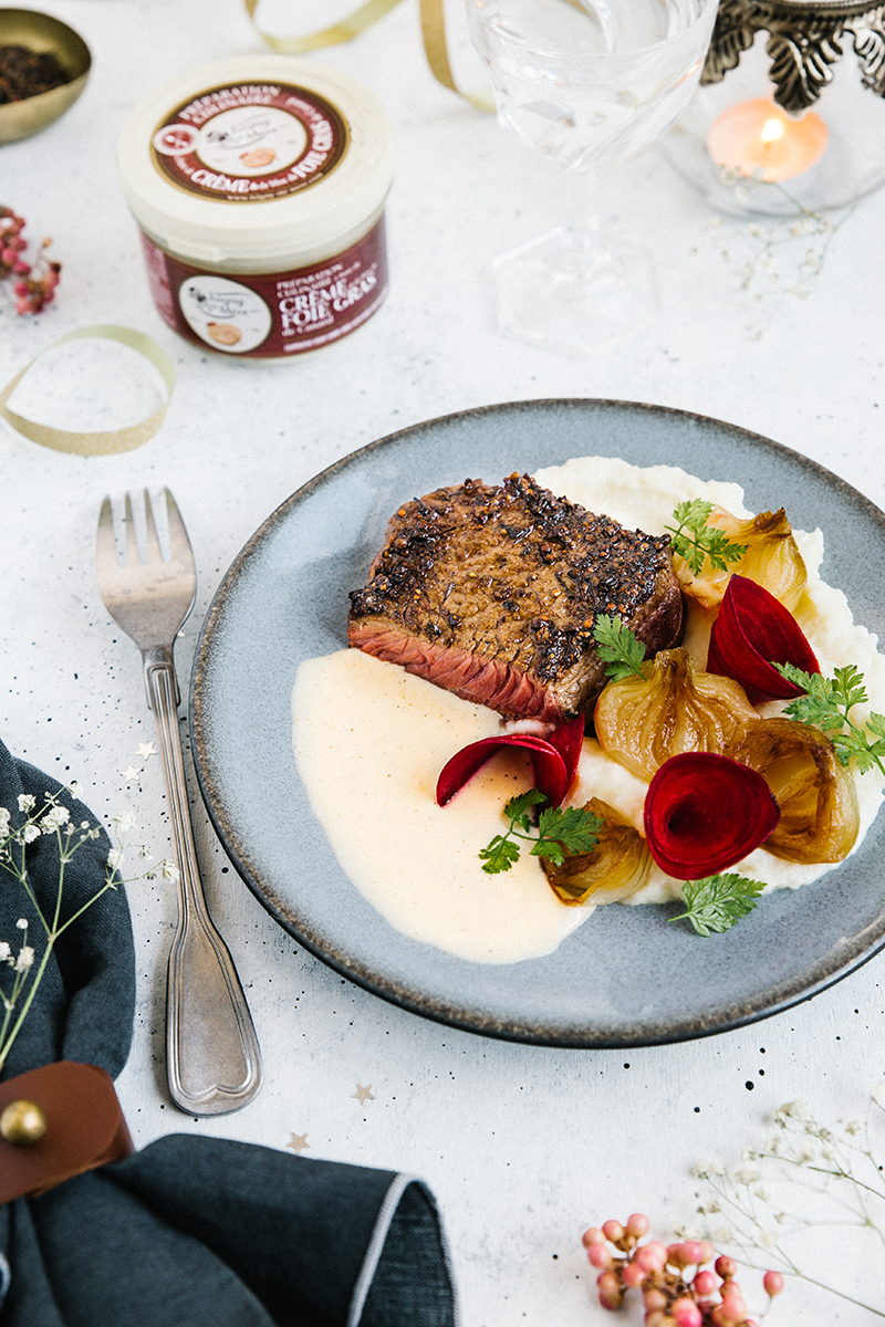 ⑨• Pour le dressage, mettre deux cuillerées à soupe de purée, le tournedos, quelques oignons caramélisés, deux cuillerées à soupe de Crème & Foie Gras – Isigny Sainte-Mère.