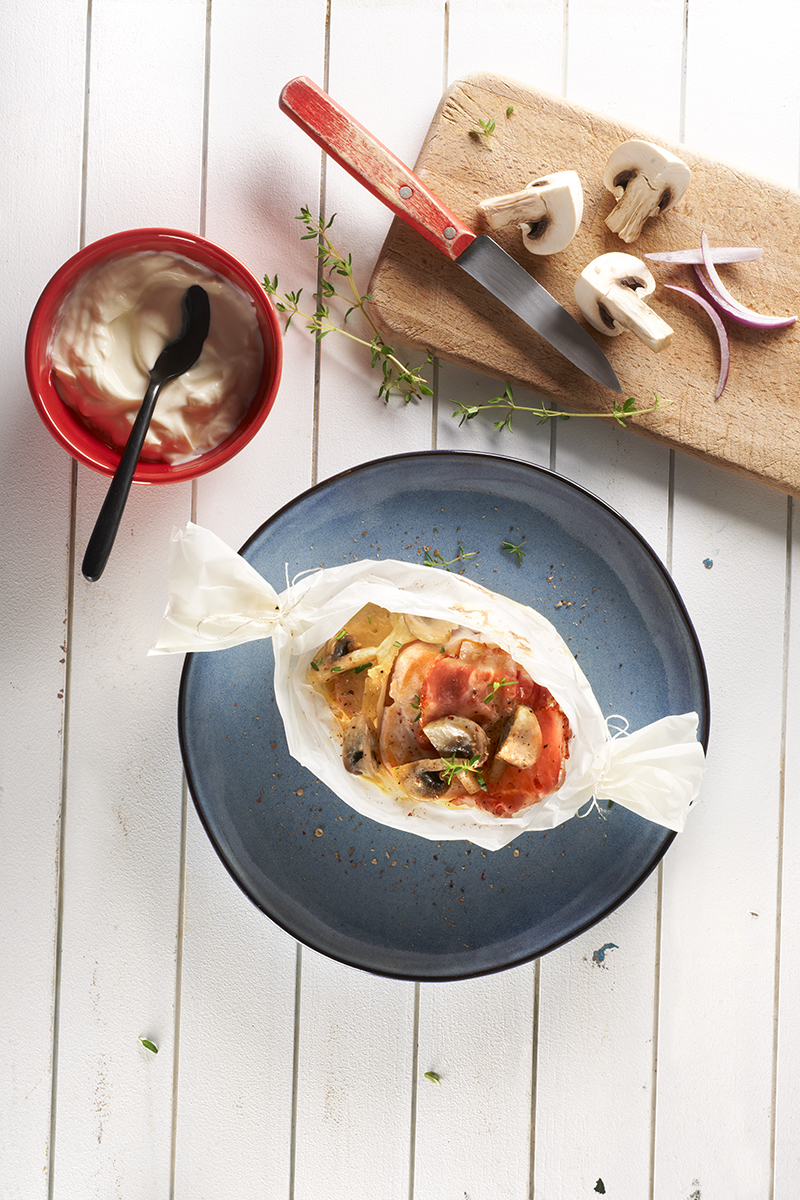 ③• Ajoutez dans la papillote les champignons coupés en 4.