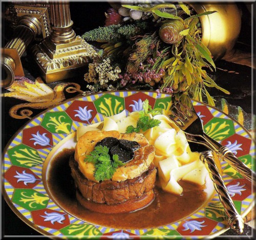 4-Installer les tournedos sur un plat. Disposer sur chacun d'eux une escalope de foie gras et une ou deux lamelles de truffe. Napper de sauce. Servir aussitôt.