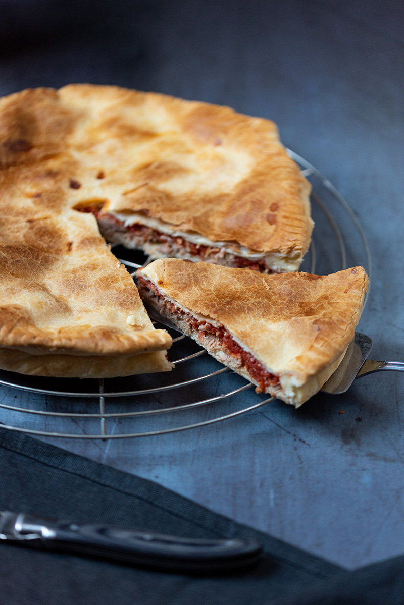 ④• Placez la deuxième pâte par-dessus et soudez les bords entre eux. Faites un trou au milieu de la tarte pour faire une petite cheminée en papier sulfurisé afin d’évacuer le trop plein de vapeur.
