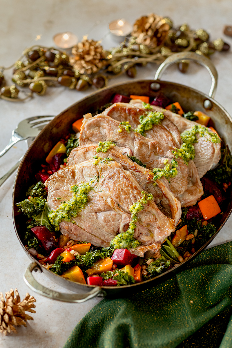 Servi en tranches, idéales pour mieux maîtriser son budget, le gigot d’agneau joue à l’occasion des fêtes la carte de la couleur et des associations de saveurs originales. Cuit avec des légumes de saison et servi avec un pesto à la pistache inspiré de la gastronomie sicilienne, il fera voyager les sens de tous les invités.