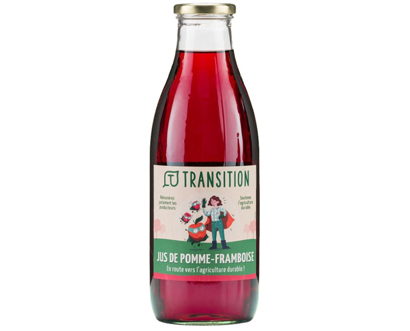 Ce jus de pomme-framboise est composé à 85% de pommes et 15% de framboises. En optant pour ce jus de fruits, les consommateurs participent à rémunérer plus justement les producteurs (en moyenne 45% plus cher que le conventionnel*).