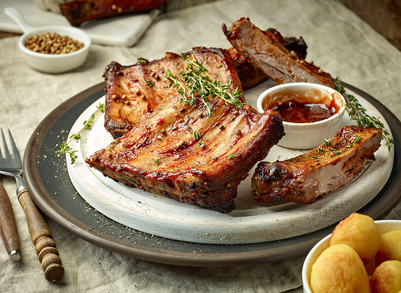 Dès que les travers sont bien caramélisés, servir avec la compote de pommes au miel.