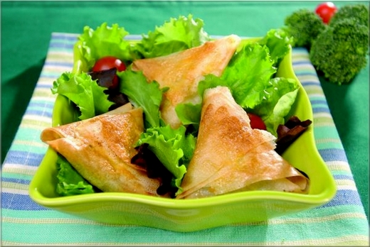 6• Disposer un triangle de brick sur une assiette. Déposer une cuillère de brocolis au milieu.