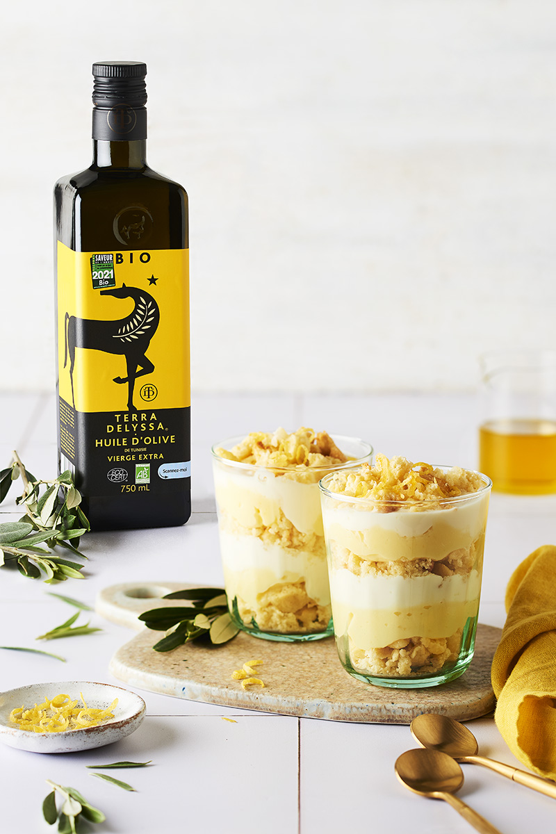 Trifle au citron, citron yuzu et sablé à l’huile d’olive