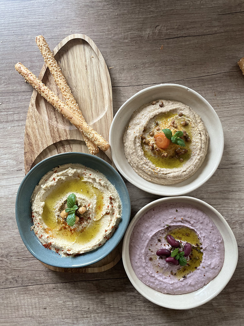 ②• Mettez-les dans le mixeur avec ½ jus de citron, 1 gousse d’ail, 2 cuillères à soupe de tahiné, une pincée de cumin, du sel. Mixez jusqu’à l’obtention d’une purée bien lisse (ajoutez un peu d’eau froide si besoin pour une texture plus homogène). Dressez dans une petite assiette et arrosez d’un filet d’huile d’olive. Réservez au frais.