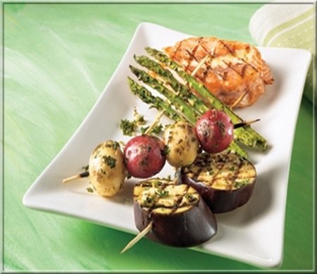 3- Déposer les brochettes d’asperges et de pommes de terre ainsi que les tranches d’aubergines sur la grille du barbecue et cuire :