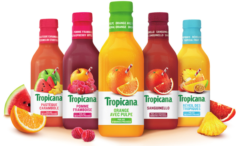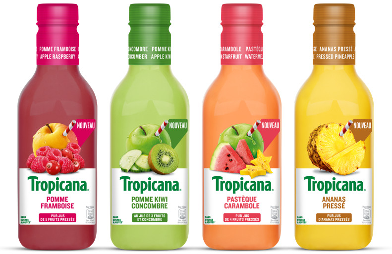 En 2019, Tropicana révèle désormais l’éclat de ses jus de fruits frais grâce à une toute nouvelle bouteille transparente et recyclable, composée à 50% de matériaux recyclés. Avec sa gamme de 20 saveurs, la marque souhaite réaffirmer la qualité de ses jus : juste des fruits pressés sans sucres ajoutés(1) pour des jus 100% plaisir.
