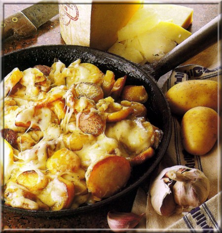 • A feu vif,ajouter les lamelles de tomme et bien mélanger.Retourner les pommes de terre qui doivent dorer et s'enrober de fromage filant.Poursuivre la cuisson 5 à 10 min.Hacher l'ail et le persil et mélanger.