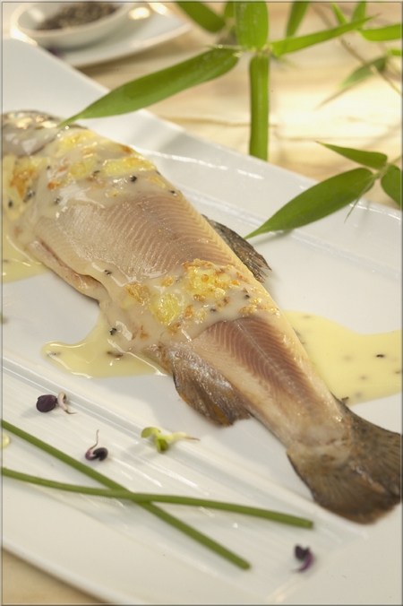 5• Retirer la peau des truites, et les arroser d’un peu de sauce.