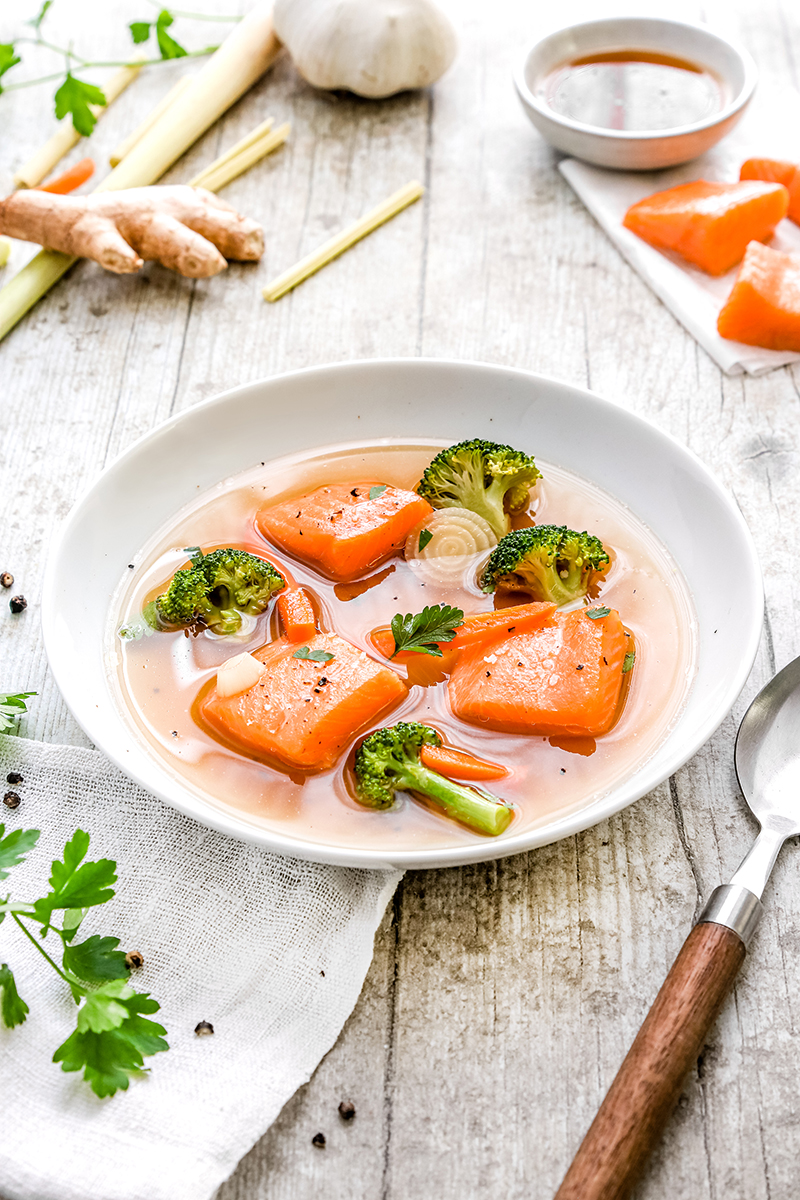 Truite mi-cuite et son bouillon de légumes