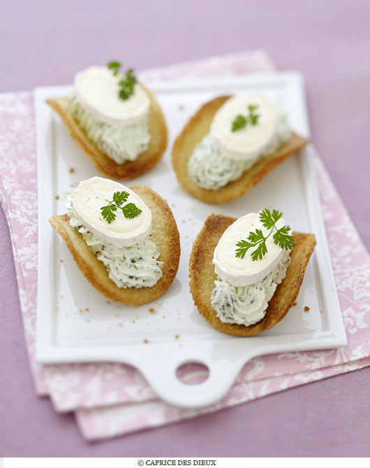 9• Déposez une noix de crème aux herbes sur chaque tuile, répartissez les morceaux de Caprice dessus et dégustez.