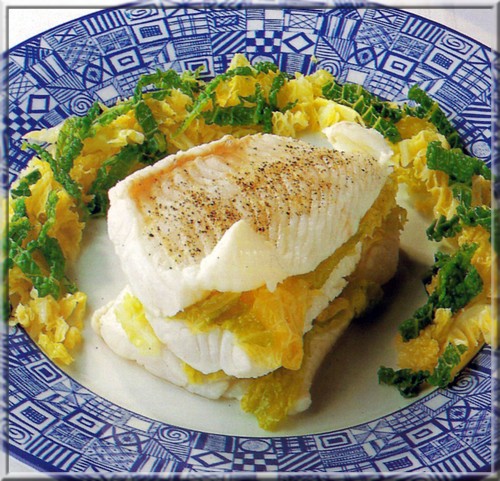 4-Laisser cuire 15 minutes à feu doux. Déposer le turbot dans un plat allant au four . Fourrer les entailles du dos avec une partie de la fondue de chou et entourer de poisson avec le reste .