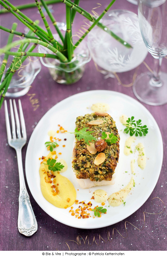 Turbot croustillant noisette amande, sauce cannelle