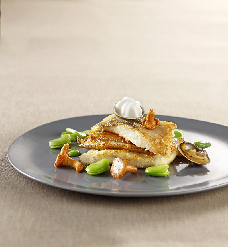 ⑧• Dresser en assiettes, le turbot au centre, les légumes autour, et 2 petits tas de mousse de palourdes.