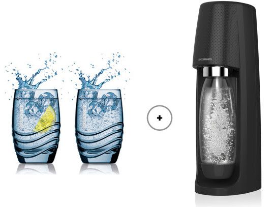 Sodastream propose un coffret exclusif comprenant une machine Spirit et deux verres sérigraphiés.