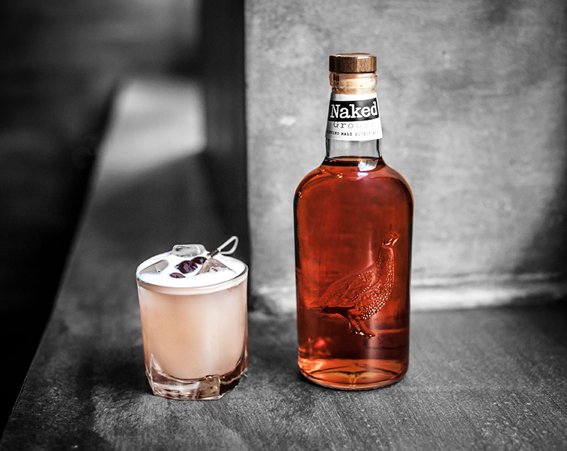 50ml Naked Grouse, 15ml citron frais, 10ml sucre, 10ml liqueur à la cerise, Trait de blanc d’oeuf