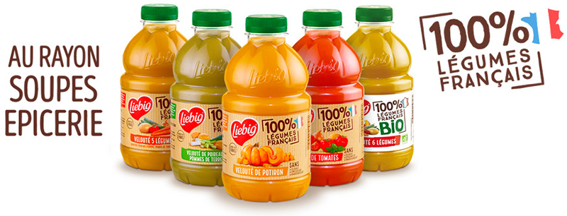 En 2018, Liebig révolutionne à nouveau le rayon avec une gamme de soupe en bouteille ! Des recettes 100% légumes français élaborées dans les ateliers de la marque en Provence. Les cuisiniers y ont retiré tout le superflu pour ne garder que le meilleur des légumes 100% origine France.