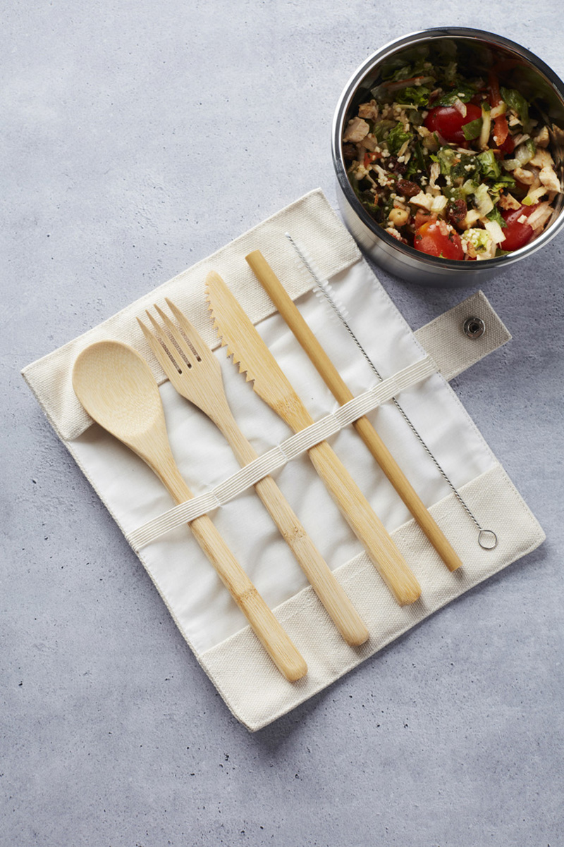 Pour un pique-nique ou pour la pause déjeuner, on sort le set à couverts protégé par une belle pochette en coton.