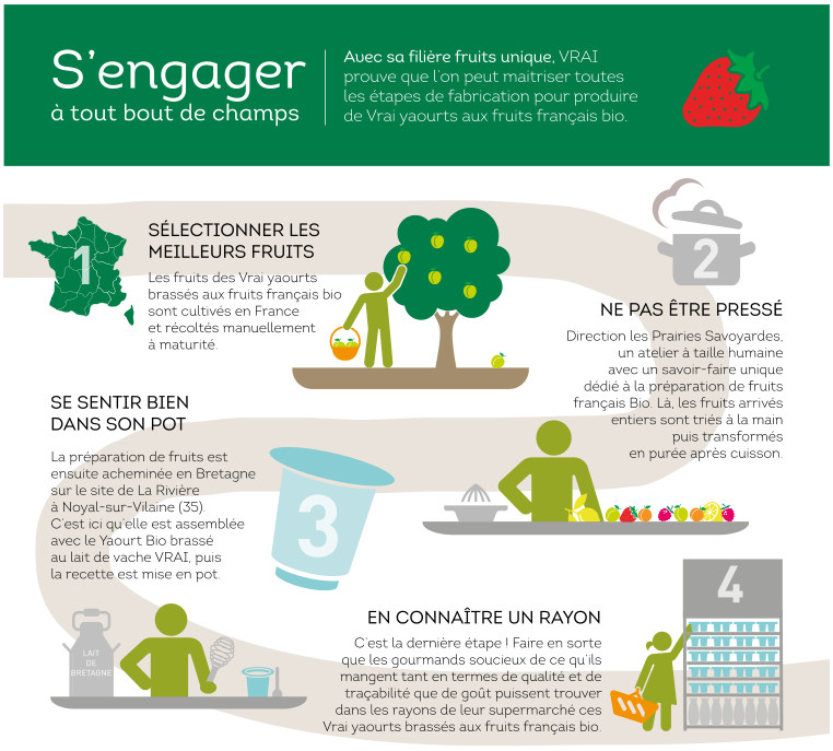 On ne peut pas être le pionnier du bio depuis 20 ans et se contenter de simples yaourts brassés bio aux fruits… C’est pourquoi, depuis 2015, VRAI propose des Yaourts brassés au lait de vache bio et aux fruits bio et français. Une première sur le marché.