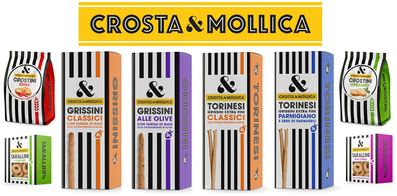 La marque a doté sa gamme d’un emballage vif et coloré qui varie selon les produits. L’omniprésence des bandes noires verticales est l’empreinte identitaire de Crosta & Mollica.