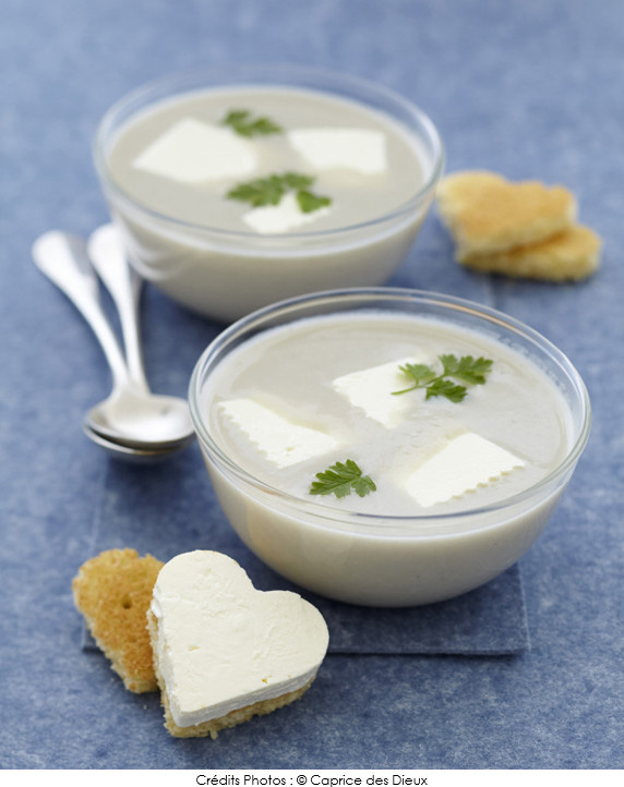 Versez le velouté très chaud dans des bols ou des coupelles, déposez des fines tranches de Caprice des Anges dessus, décorez avec des pluches de cerfeuil et servez avec les toasts cœur.