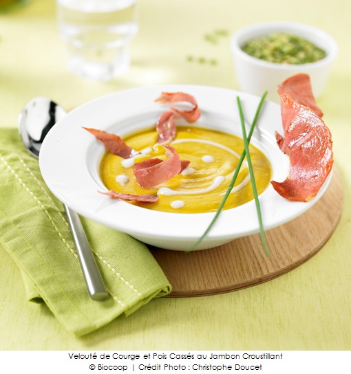 Velouté de Courge et Pois Cassés au Jambon Croustillant