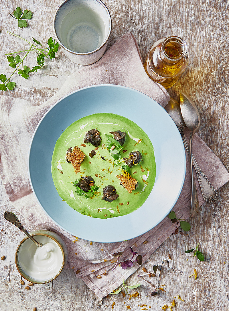 Velouté de cresson à la Crème Fraîche Chavroux®, escargots et graines de tournesol grillées