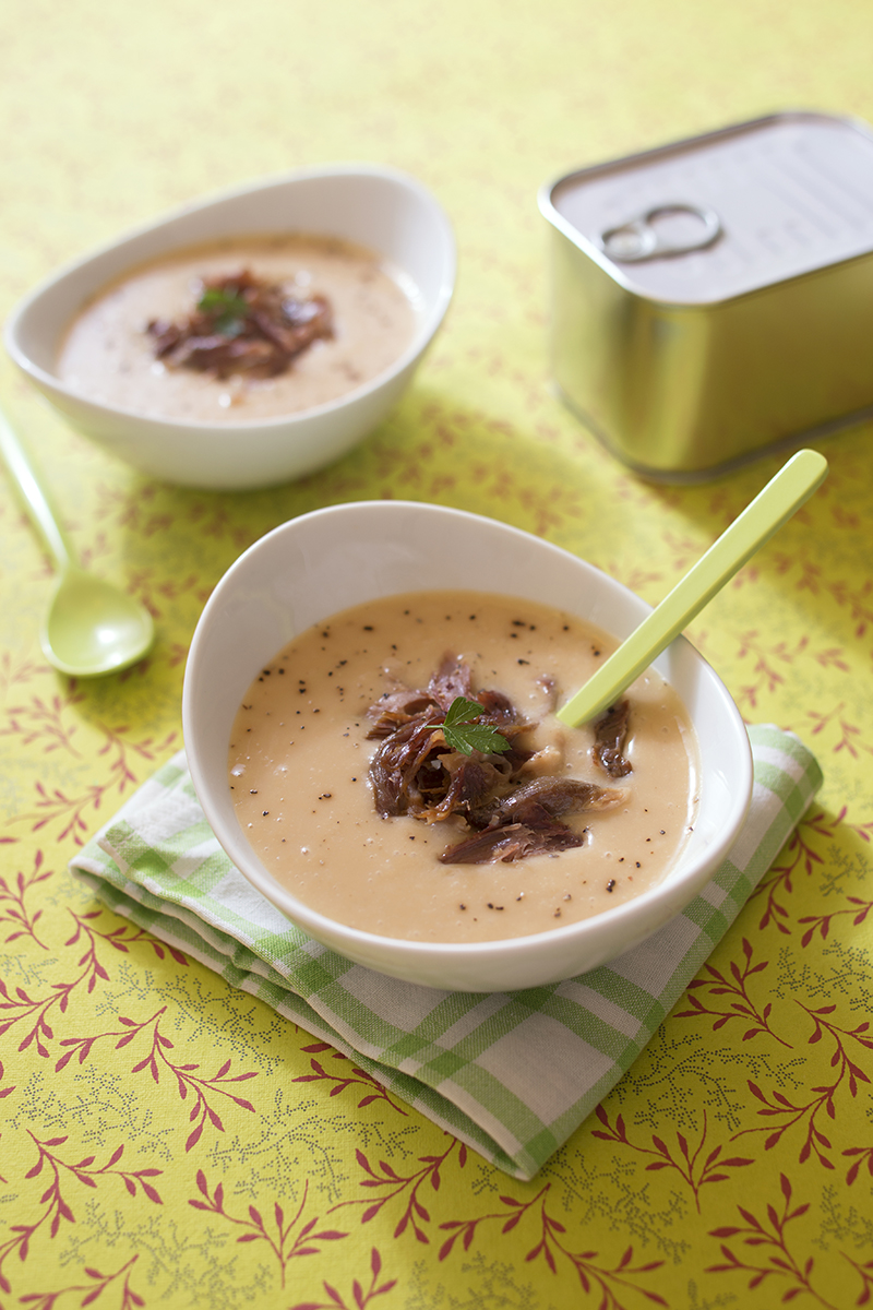 Servez-le dans des bols avec le canard émietté sur le dessus.