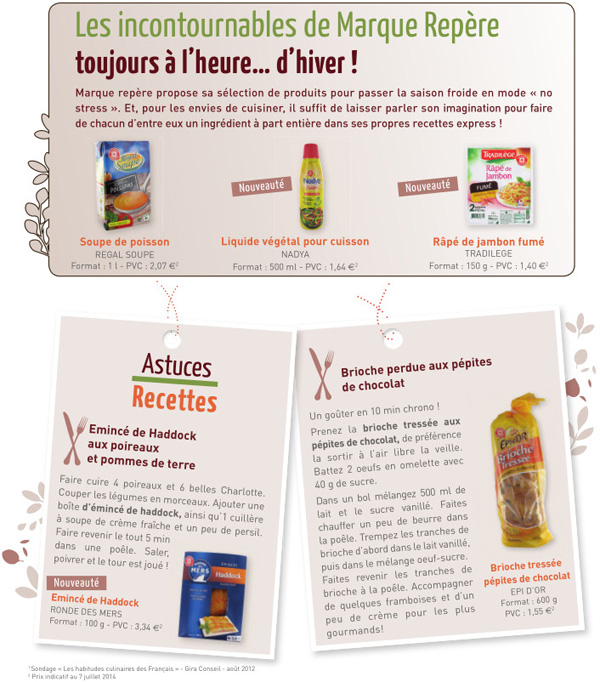 Marque Repère, la Marque de Distributeur des Centres E.Leclerc est créée en 1997. Aujourd’hui, elle compte plus de 6000 références allant de l’alimentaire, à l’hygiène et soin en passant par l’entretien de la maison. Engagée dans des démarches éco-responsables, la marque propose un rapport qualité/bénéfi ce/prix inégalé.