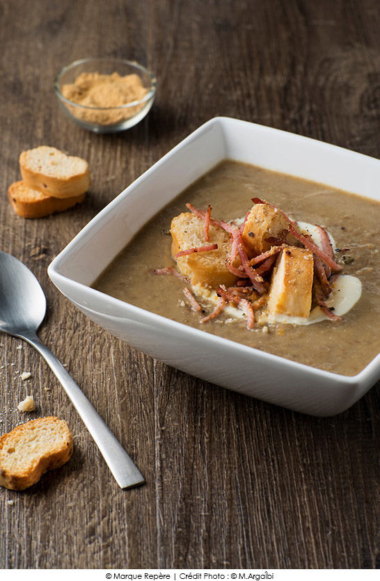 en se mêlant aux saveurs fumées du velouté de lentilles au jambon :