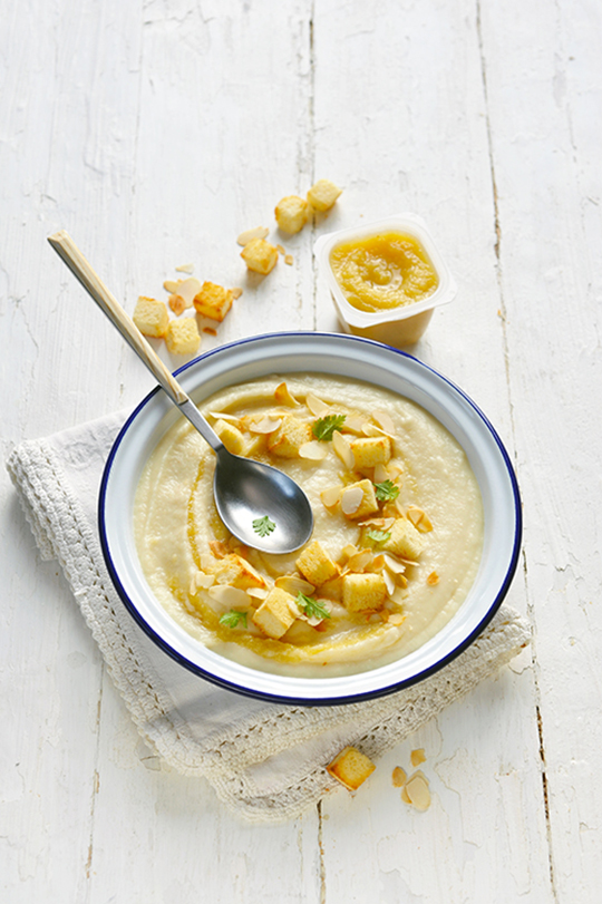 ⑤• Dans une poêle, versez les amandes et faites-les dorer durant 2 minutes en remuant régulièrement. Servez votre velouté dans les assiettes, ajoutez une cuillerée de Charles & Alice Sans Sucres Ajoutés Pommes Clémentines par-dessus et mélangez rapidement.