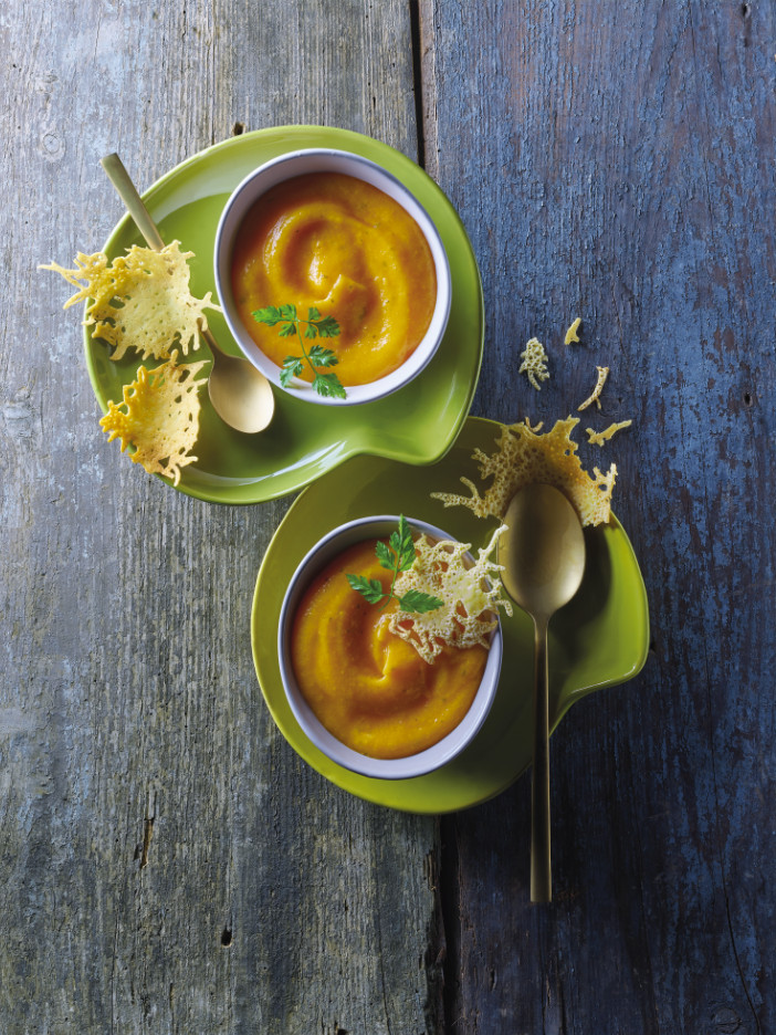 Velouté de patates douces et carottes à la pointe de muscade, tuiles au Beaufort