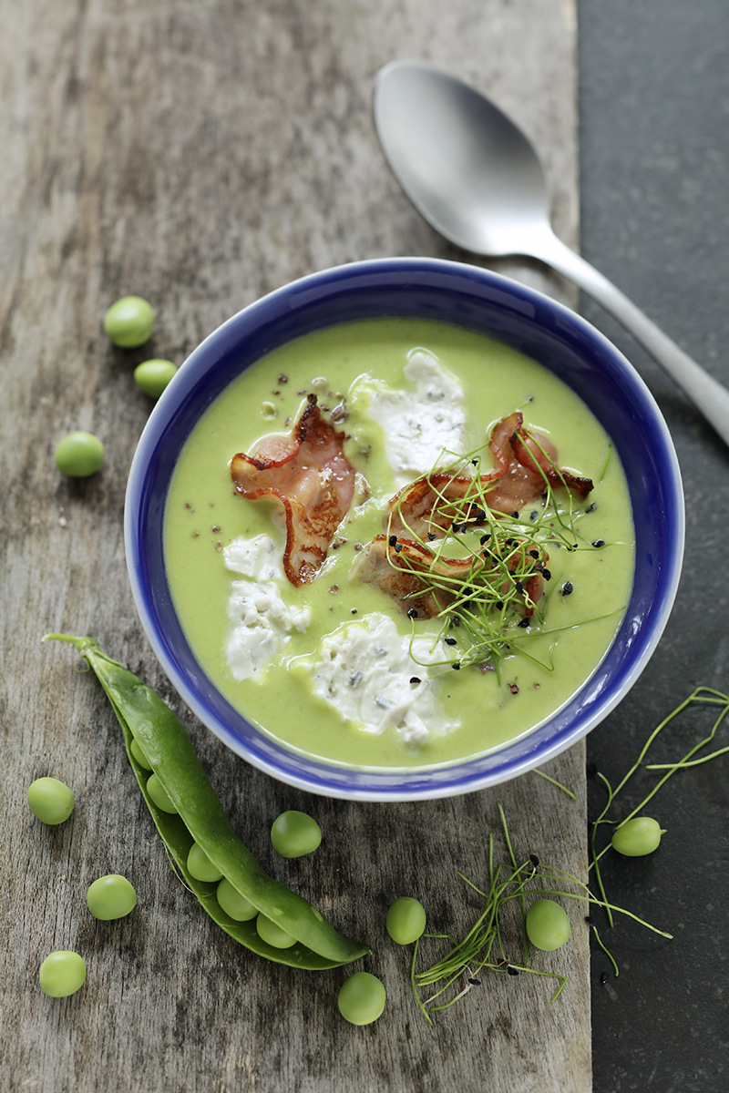 Une recette de velouté de petits pois tout en douceur et onctuosité, accompagné d’une croustillante tranche de lard. Avec une touche de Saint Agur Frais Plaisir, ça change tout !