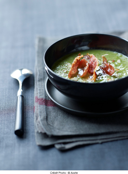 Velouté de petits pois aux amandes et ses chips de Jambon Serrano Aoste