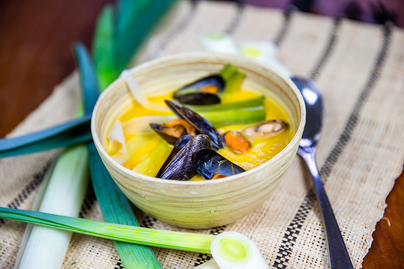 Velouté de poireaux de Normandie, carottes et moules poêlées