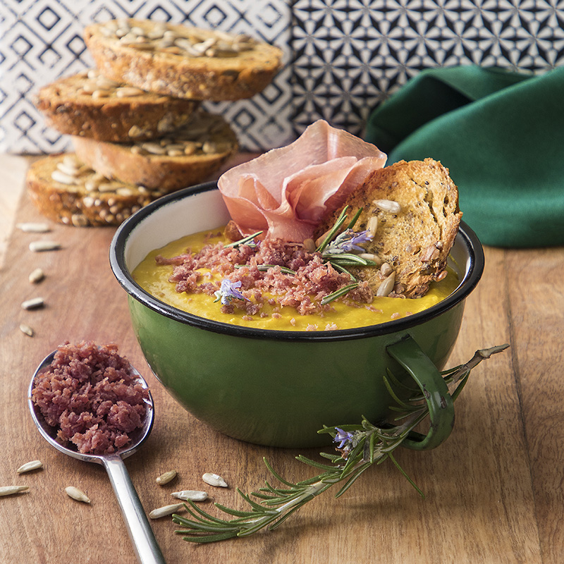 Velouté de pois chiches, curcuma, croûtons de graines de tournesol et Jambon de Parme