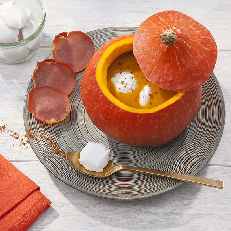 Velouté de potimarron, glaçons au lait de coco et chips de bacon
