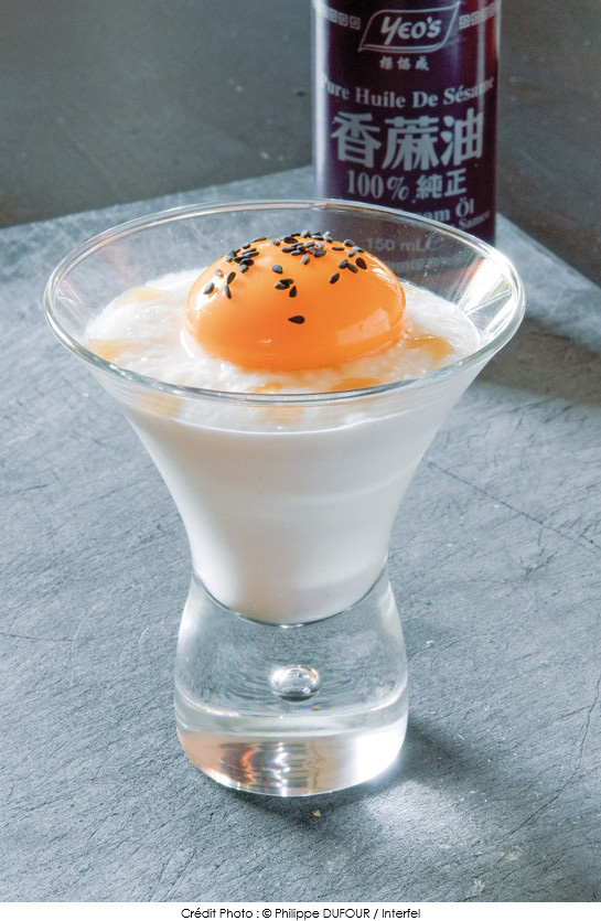 Parfumer, en finition, de quelques gouttes d’huile de sésame et décorer de graines de sésame noir.