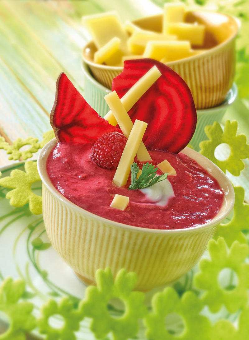 Velouté glacé à la betterave, aux framboises et au Beaufort
