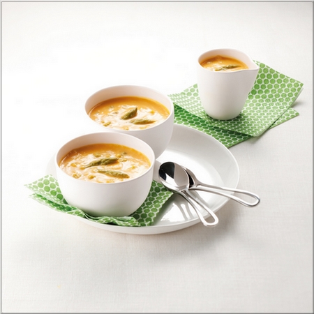 2• Verser dans le mixer le contenu de la boîte de carottes et les queues des asperges, mixer et ajouter le bouillon, la crème, le sel et le poivre.