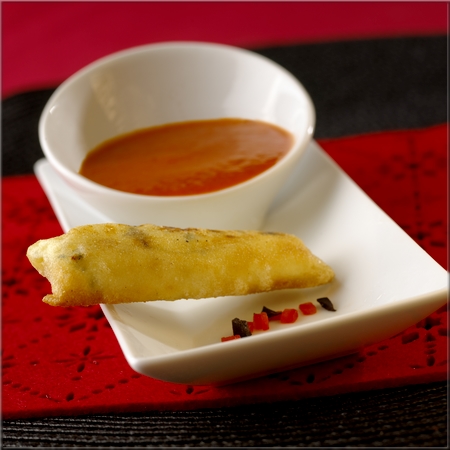 Servez le velouté de poivrons bien frais accompagné des nems au fromage.