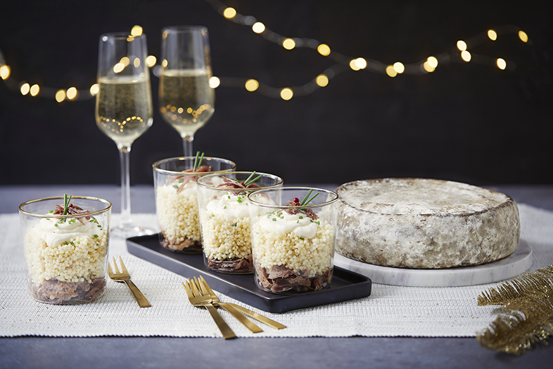 Verrine de confit de canard, perles Alpina, Tomme de montagne à la truffe d’été Pochat & Fils