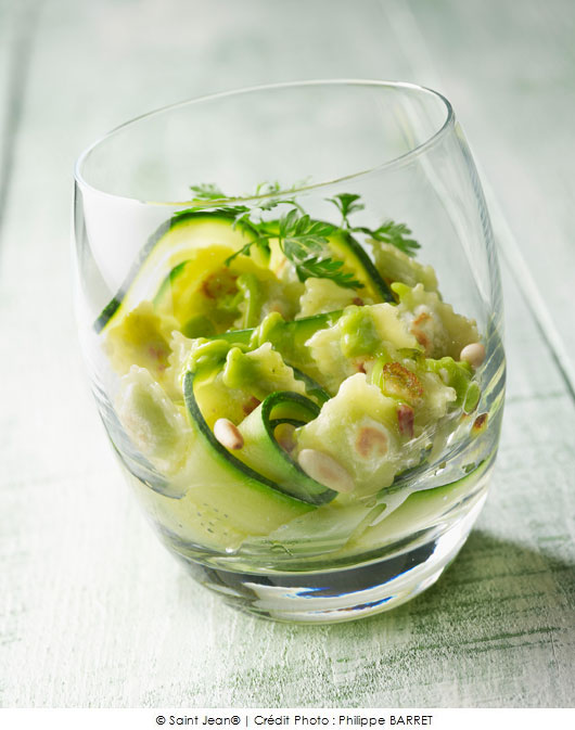 5• Disposez les rubans de courgettes au fond de 4 verrines, ajoutez une cuillère de sauce au guacamole et parsemez de pignons et de ravioles à poêler.
