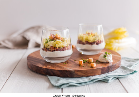 – Garnissez le fond de la verrine de crème moutardée, recouvrez de poitrine émincée et terminez par les petits morceaux de Friseline.
