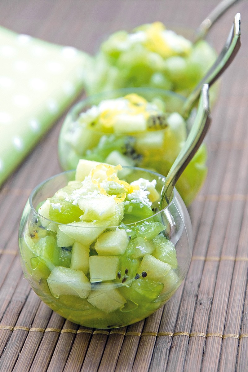 ①• Peler les kiwis et les pommes. Les tailler en très petits dés. Presser le demi-citron.