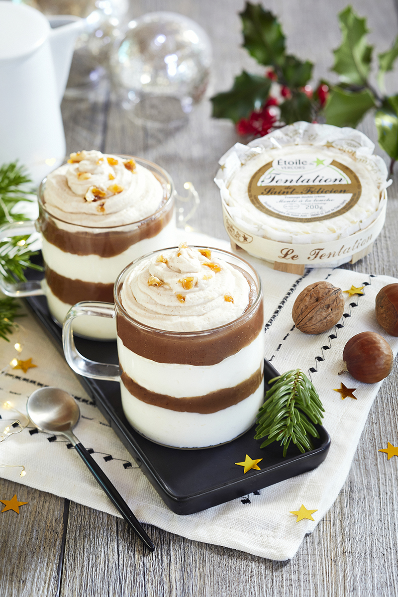 ⑥• Effectuez le montage des verrines, en alternant une couche de crème au Tentation de Saint-Félicien et une couche de crème de marron. Pour la dernière couche, déposez à l’aide de la poche à douille, le mélange crème au Tentation de Saint Félicien et crème de marron sur le dessus de la verrine, en formant une spirale qui se referme vers le haut. Puis déposez quelques cerneaux de noix caramélisées concassés sur le dessus.