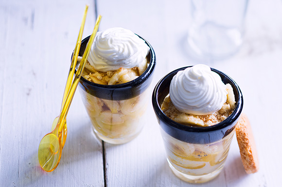 ④• Répartir les bananes dans 4 verrines avec le jus, verser un filet de lait concentré, parsemer de sablés bretons puis disposer la chantilly.