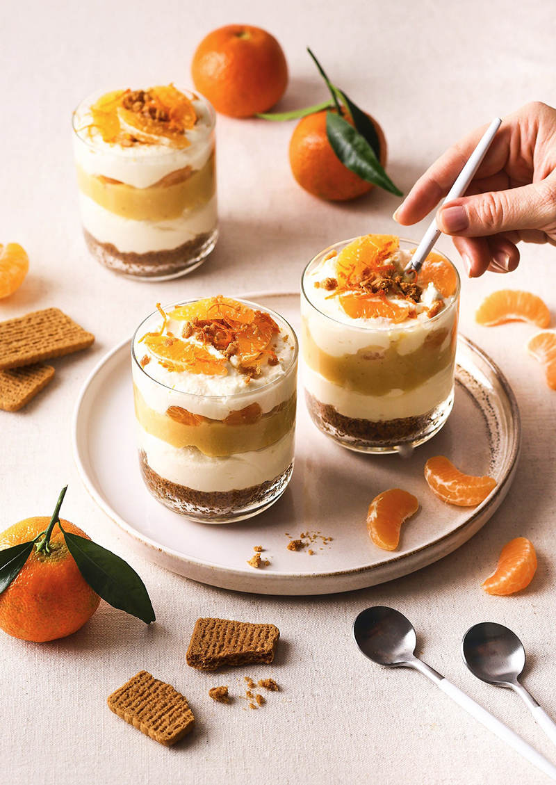 Décorer les verrines avec quelques morceaux de Clémentine de Corse IGP, des brisures de biscuits et des zestes.