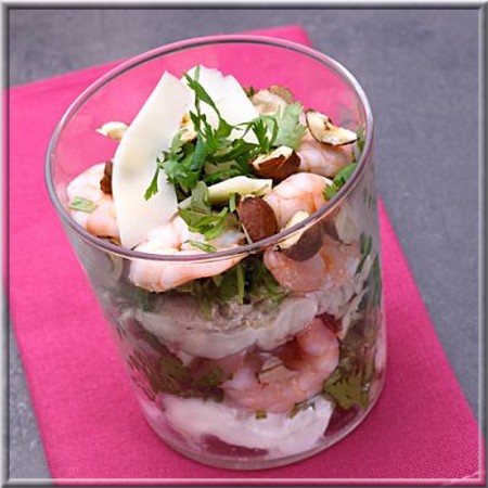 Monter vos verrines en alternant l'émincé de coriandre, les crevettes, les noisettes et la préparation fromagère.